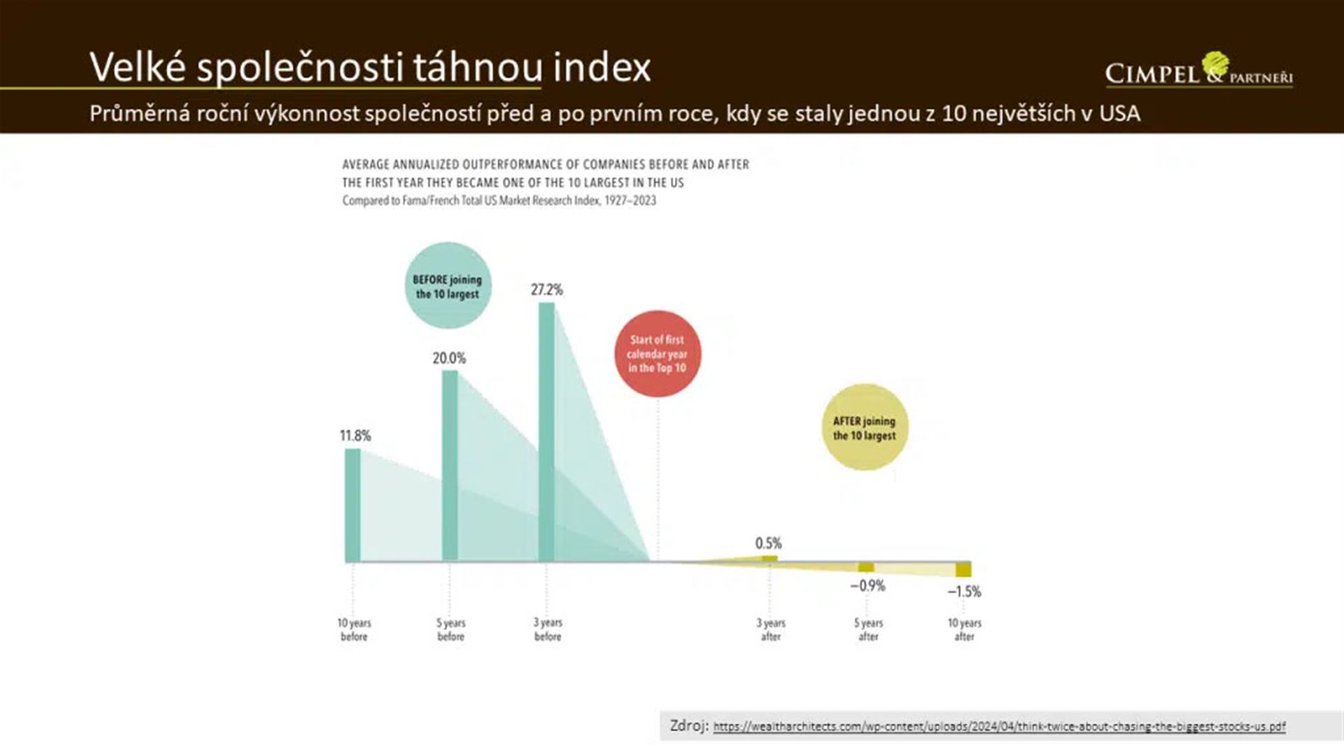 Tady můžeme vidět, že od roku 1927 do současnosti ty firmy vydělávaly hlavně předtím, než se staly těmi největšími. Můžeme vidět, že v průměru nesly třeba v 10 letech před tím, než se staly těmi 10 největšími, 11 %. V posledních 3 letech před tím, než se staly 10 největšími, nesly třeba 27 % ročně. A potom, co se staly největšími, ten výnos (pravá strana) většinou celkem citelně ochladnul. Dokonce spíš měly tendenci klesat a nebyla tam ta výkonnost. Takže pozor na to!
