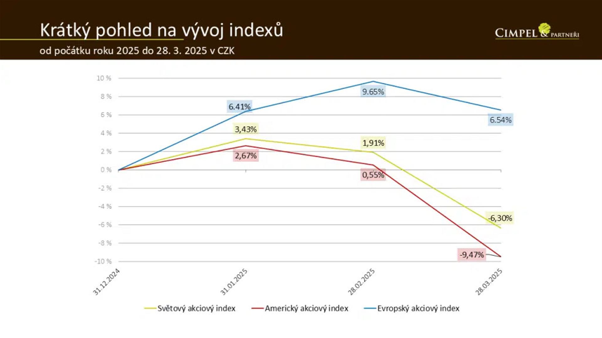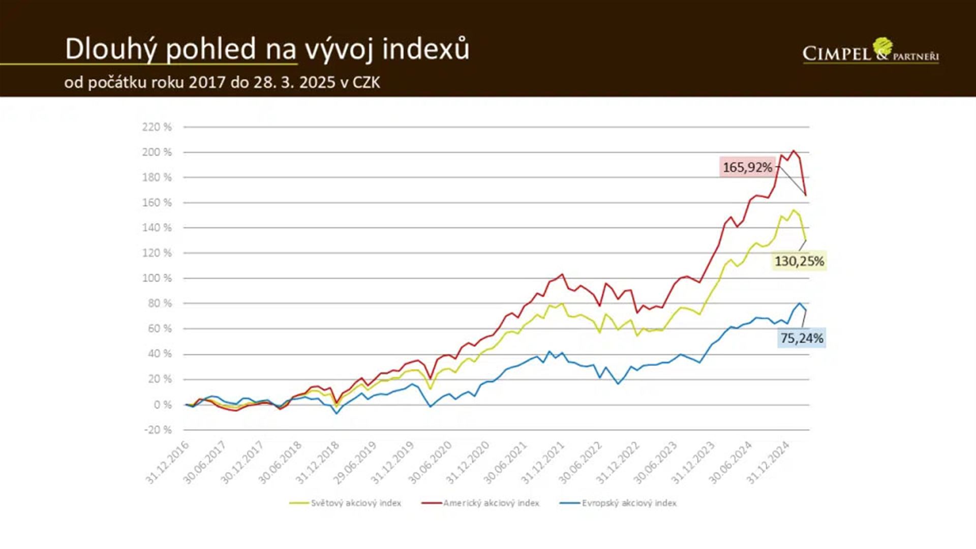 Zde se díváme od roku 2017 do března 2025 a můžeme vidět, že portfolio třeba v globálních akciích je plus 130 %. Když vezmeme třeba americké akcie, kde jsme říkali, že bylo -10 %, tak můžeme vidět, že ten meziměsíční pohyb na tomhle obrázku není o 10, ale o 20 %. Protože se skutečně díváme až na 200násobek počáteční hodnoty naší investice a ten 10% pokles není ze zisku. Není to tak, že můj zisk klesl o 10 %, ale o 10 % klesla cena indexů v aktuálním vyjádření. A tento pohyb je menší, než ten, kdy se díváme, o kolik mi klesl kumulovaný zisk na celou dobu. Někdy slýchám investory, kteří investují kratší dobu, jak mi říkají, ale my jsme od začátku roku ukrojili třetinu mého výnosu, který jsem kumuloval tři roky.