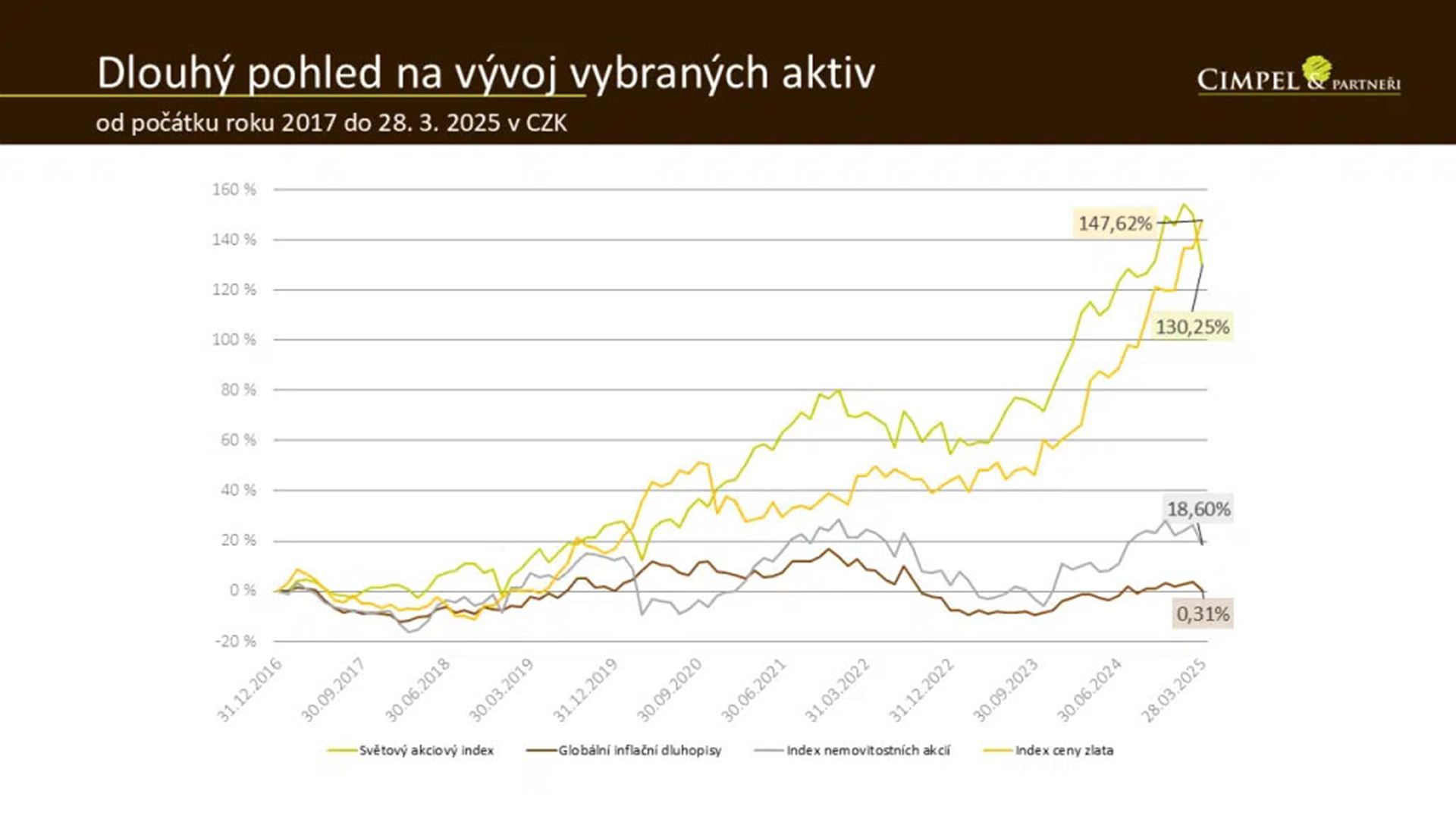 Jiří: Při pohledu na delší časové období můžeme vidět, že od roku 2017 jsou růsty vysoké. Navzdory poklesu z minulého měsíce zůstávají globální akcie v růstu, a to přes 130 %.