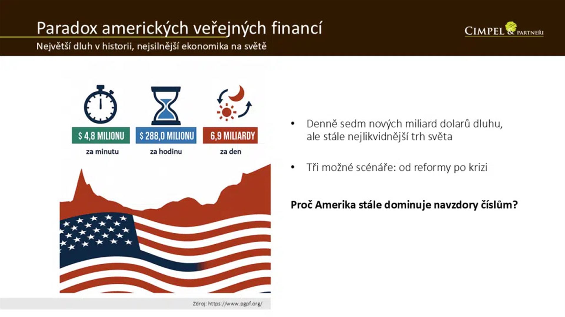 Dan: Řešení nějaké pravděpodobně bude mít, ale zatím nevíme, jak to dopadne. Ty scénáře jsou v podstatě tři. Buď se udělá nějaká politická reforma, což v současné chvíli vnímáme spíš jako nepravděpodobné. Co je pravděpodobnější, že nastane status quo. Nic moc se nezmění a pojedeme v tom režimu, jak jsme. Dluh se bude postupně navyšovat a je to nějaký strukturální problém, který se dřív nebo později bude muset vyřešit. Další nepravděpodobný scénář je, že se ztratí důvěra v americkou ekonomiku a dolar jako takový, což si neumím moct představit, že by nastalo v současné chvíli.
