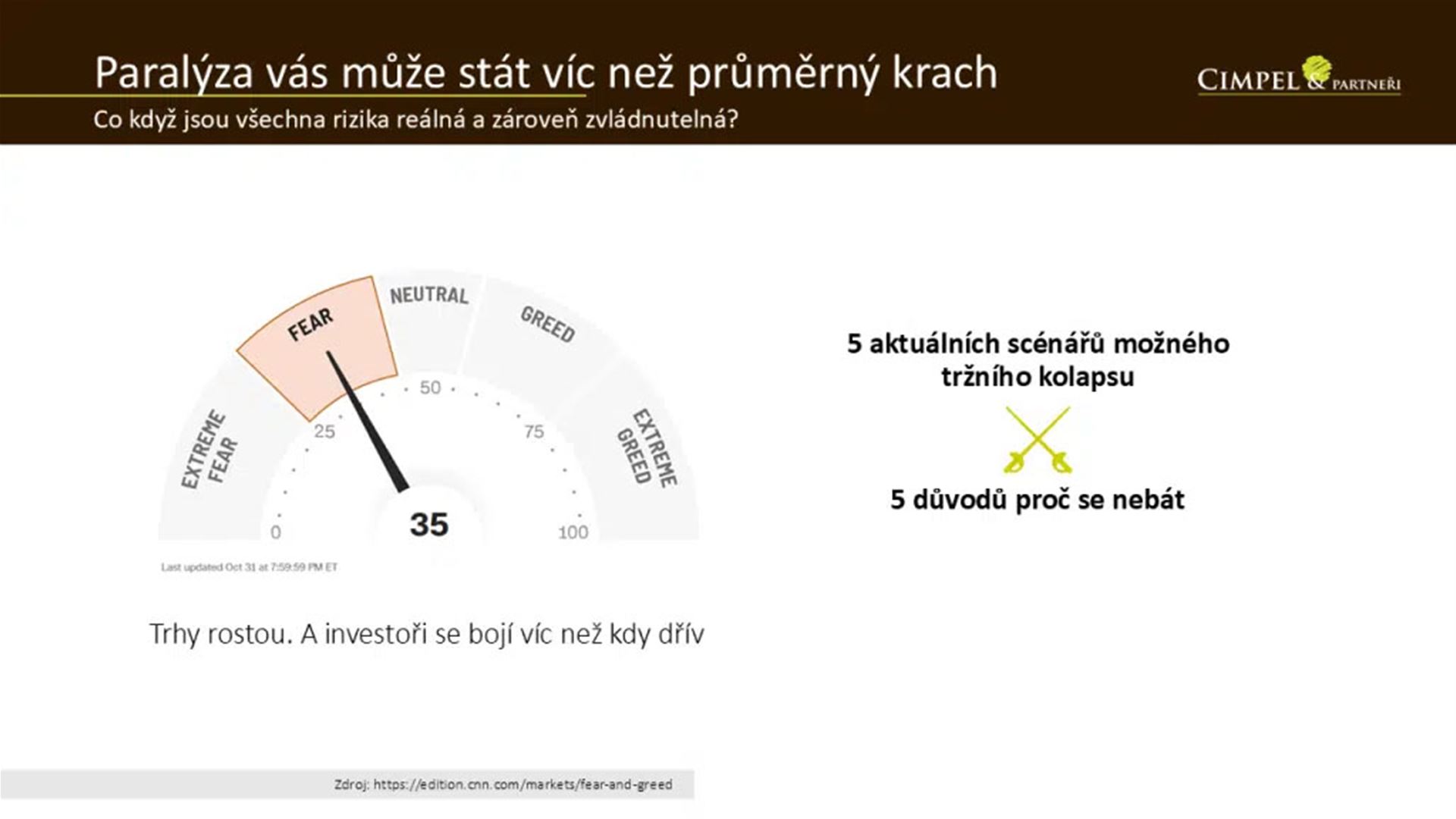 Dane, můžeme v krátkosti rozebrat, co jsou ty scénáře, které jsou v tuto chvíli před námi, že by mohly způsobit nějaký případný problém? Protože tím, že jsou trhy na vrcholu, investoři samozřejmě mají vždy obavy a vždy hledají ty černé scénáře. Co jsou ty scénáře, které teď vidíme? A je potřeba se jich obávat nebo jak s nimi pracovat?