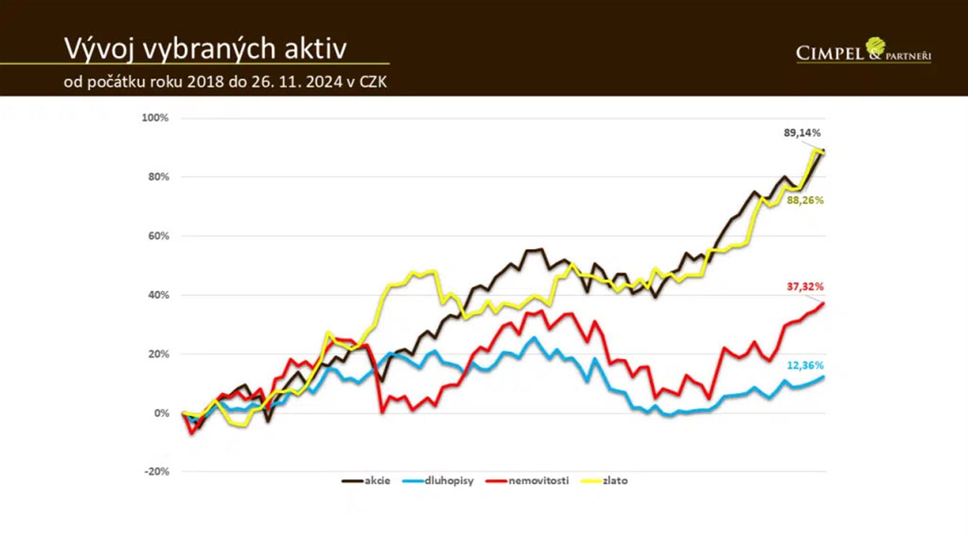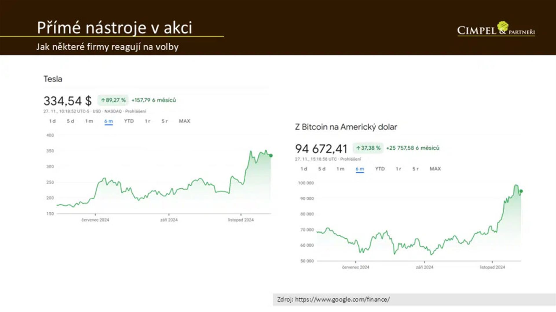 Když se podíváme na konkrétní aktiva, kterým zvolení pomohlo velmi citelně, byly to třeba akcie Tesla, které vyskočily o 40 % během krátkého okamžiku. Můžeme vidět i Bitcoin, který reagoval velmi rychle a z ceny 70 tisíc dolarů za Bitcoin se chvíli držel hranice na úrovni 100 tisíc, což byl dlouhodobý pomyslný milník, kam se snažil Bitcoin dostat. Chci na tom ukázat, že změna ceny těchto aktiv, ať to byly akcie Tesla nebo cena Bitcoinu, nestojí na změně fundamentu.