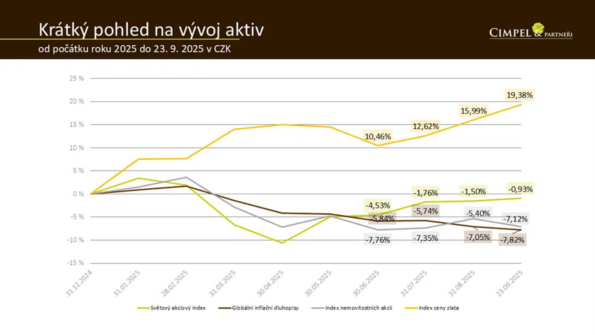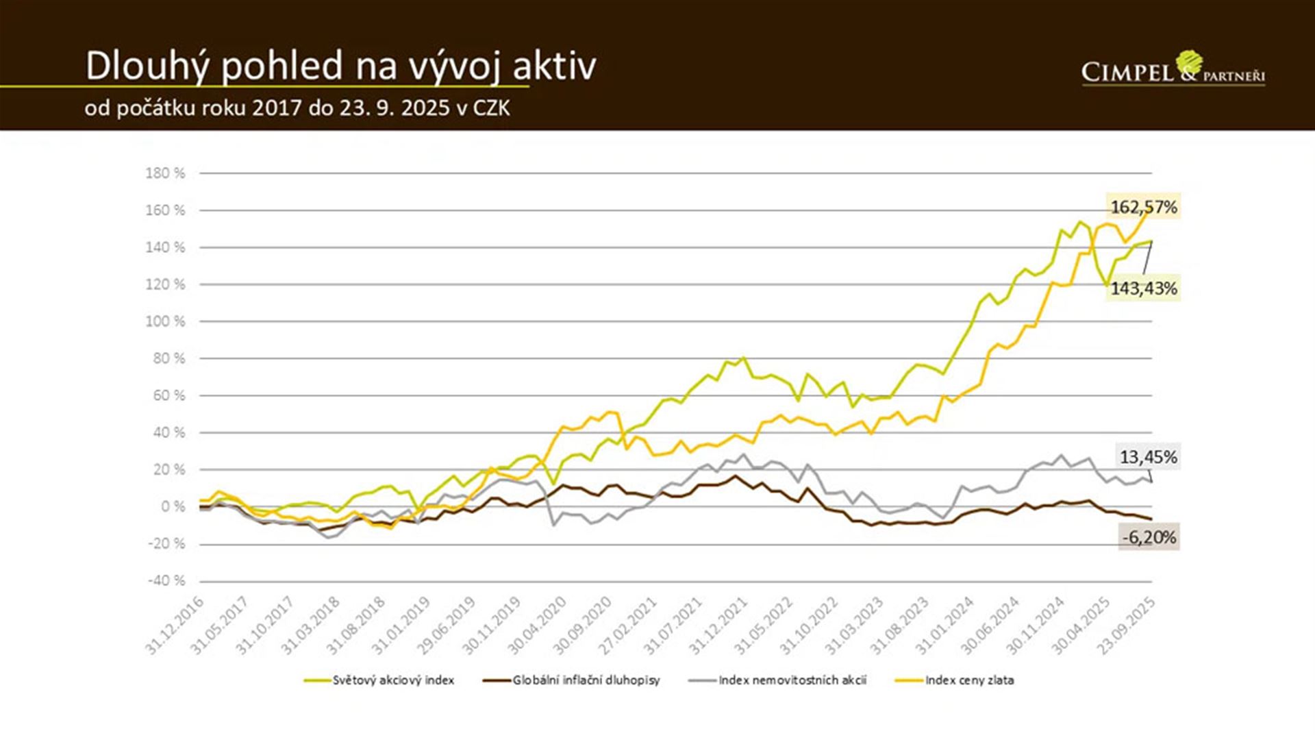 Dan: Je dobré si uvědomit, proč to tak je. Jednu z věcí jsme už říkali. Růst ceny zlata je tažený geopolitikou a tím, že ho poptávají instituce. Růst akcií je tažený tím, že se začaly snižovat úrokové sazby.