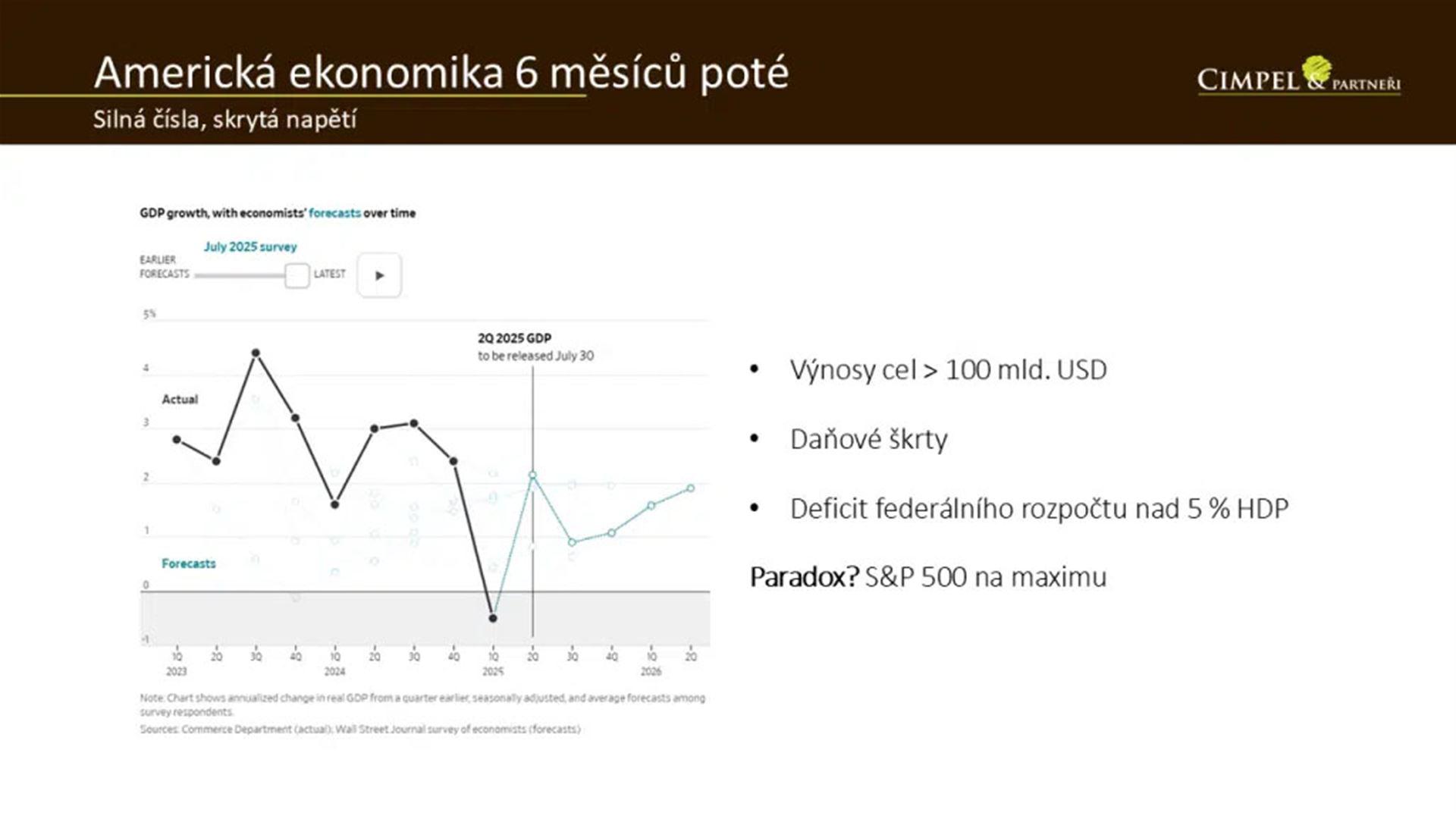Je to tedy určitý paradox, kdy vidíme S&P 500 na maximu, vidíme potenciální rizika, která tato protekcionistická opatření mohou přinést, ale zatím se do ekonomiky nepromítají. Mohou se promítnout v budoucnu, můžeme vidět i pokles americké ekonomiky, ale určitě to není z našeho pohledu něco, co by bylo kritické, abychom měli strach investovat do akciového trhu. Naopak to může přinést i příležitosti, že koupíme ve slevě. I z dnešního pohledu stále díky silné koruně můžeme vstupovat do zahraničních aktiv s určitou slevou.
