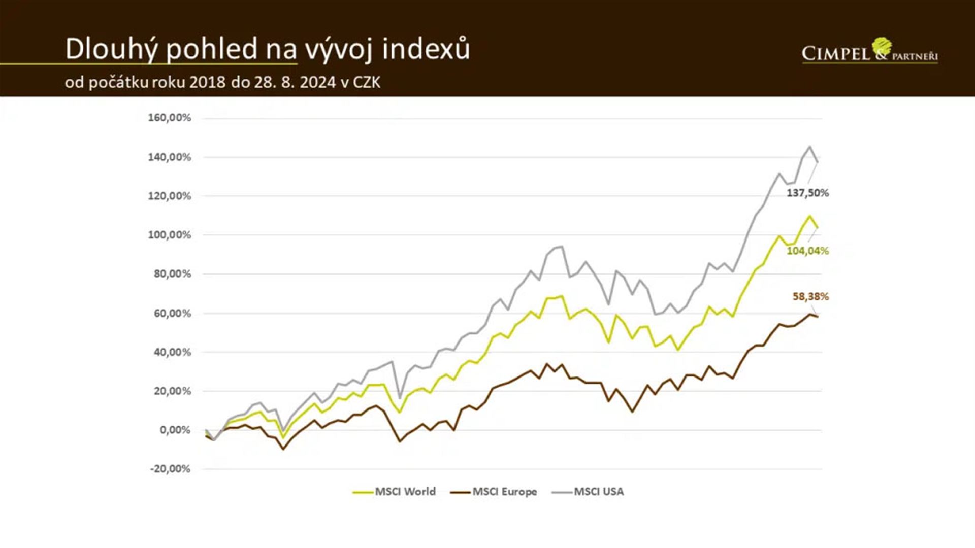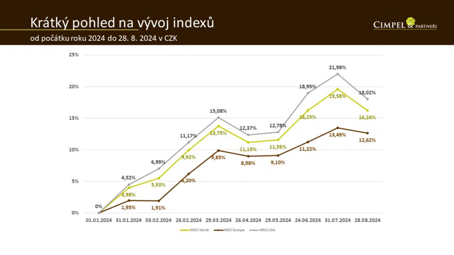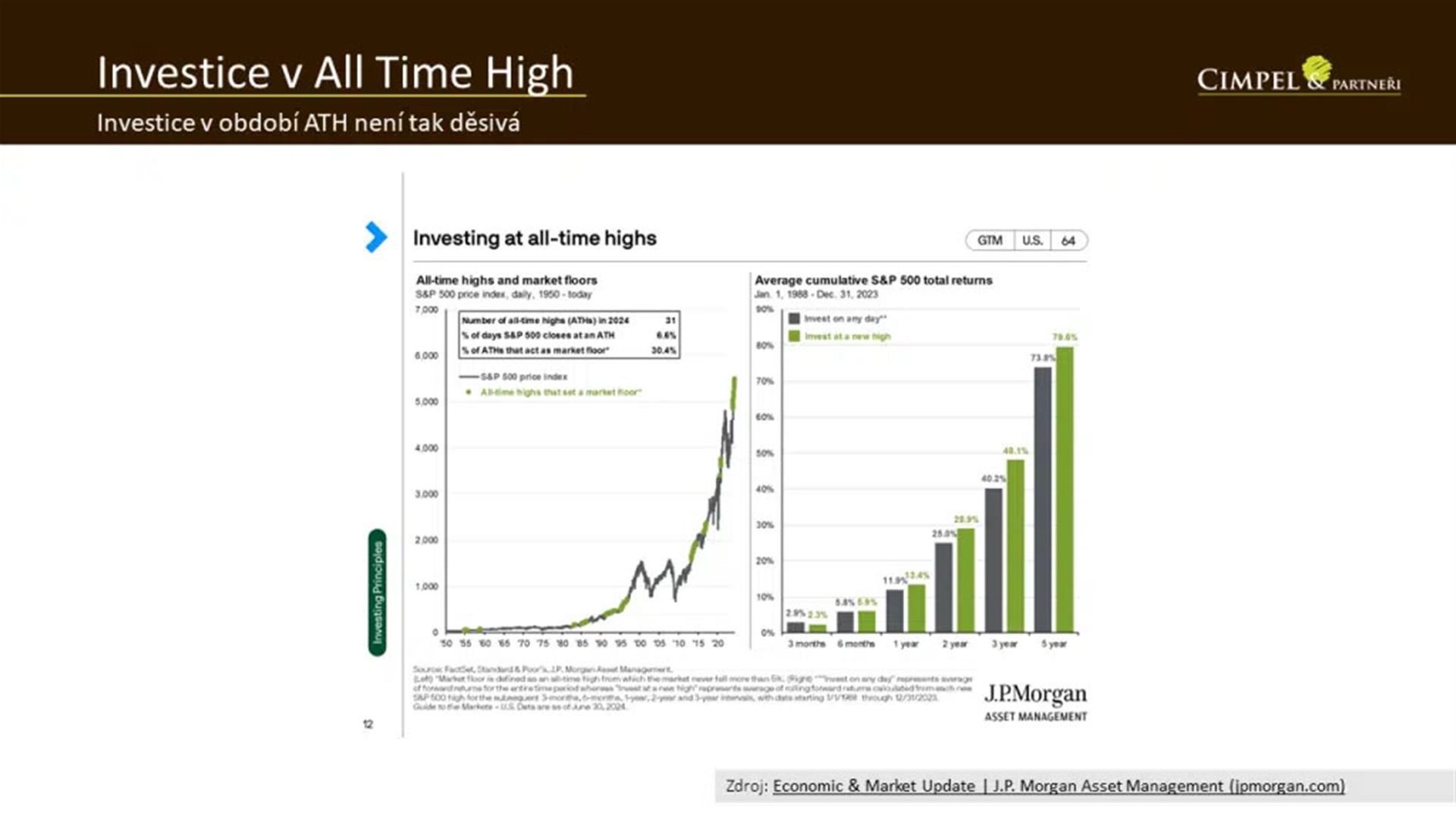 Jiří: Na závěr mám téma související s otázkou, jestli je vhodné investovat, když jsou trhy na svých maximech, když jsou v tzv. all time high režimu. Je dobré říct, že maxima trhy dosahují celkem běžně. Jenom od začátku letošního roku konkrétně americké akcie indexu S&P 500 překonaly svá historické maxima už 31krát. Takže to není zase tak vzácný okamžik. Je to vlastně něco, co od trhu běžně očekáváte, že cena bude v čase postupně narůstat. Přesto je to samozřejmě vždy okamžik, kdy si říkáme, teď jsou trhy na maximech, nepůjde to dolů? Je vhodné vkládat peníze? Nemám počkat, až přijde nějaký pokles?