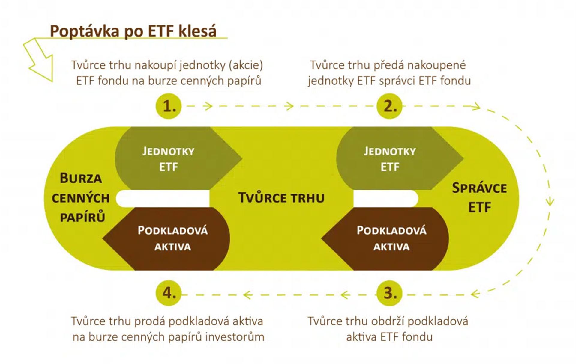 Správci ETF spolupracují s tvůrci trhu. Když roste poptávka po daném ETF, tvůrci trhu mohou vytvořit nové jednotky tím, že vymění podkladová aktiva za nové jednotky ETF. Naopak, když je poptávka po ETF nízká, tvůrci trhu mohou rušit existující jednotky tím, že vrátí podkladová aktiva správci ETF.