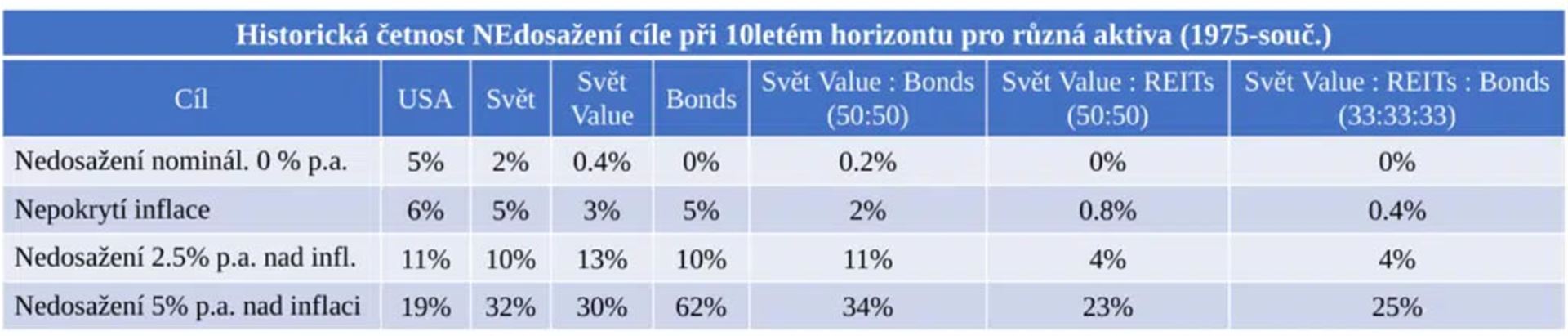 „Pomocí jen malé diverzifikace šlo v historii i s krátkým 10letým horizontem negativní scénáře velmi dobře potlačit. Jak ukazuje tabulka níže, od roku 1975 (od kdy jsou data k dispozici) až do současnosti dokázalo výrazně srazit riziko nominální i reálné ztráty jednoduché zařazení světových, ideálně hodnotových, akcií. Dále dodatečným přidáním dluhopisů v poměru 50:50, případně ještě zařazením nemovitostí pomocí REIT akcií, jsme mohli v tomto historickém období prakticky vyrušit jakoukoli šanci na ztrátu kapitálu i po započtení inflace.