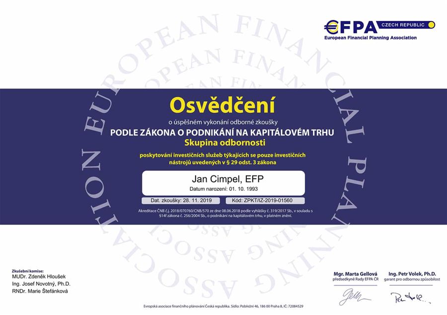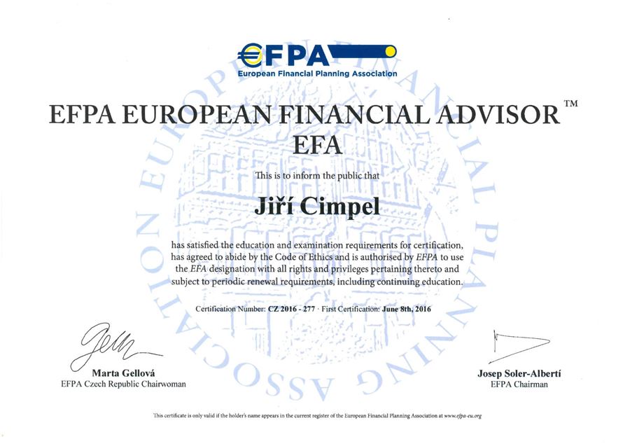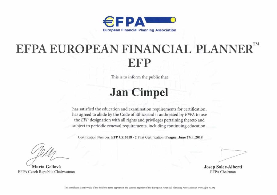 Certifikace EFP a EFA představují vrchol evropského uznání ve finančním plánování. Jsou zárukou špičkové odbornosti i nezávislého přístupu k vašim financím. V Česku je jako první získali Jan a Jiří Cimpelovi.