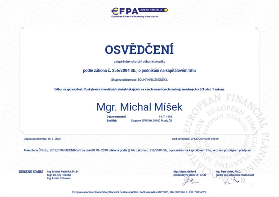- EFP – European Financial Planner – mezinárodně uznávané zkoušky finančního plánování, 2017 – 2018